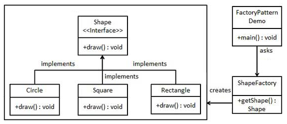 Klasa "factory" (if-else'ami) zwraca konkretną implementację (Square, Circle) typu ogólnego (Shape), na podstawie przekazanego argumentu.